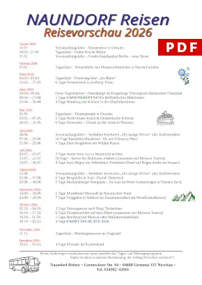 | Reiseleistung | Busfahrt, ganztägige Gästeführung ab/an Thüringen, Mittagessen (Spargelgericht), geführte Eichsfeldrundfahrt durch herrliche Natur und schöne Dörfer inkl. Besichtigung einer Wallfahrtskirche, Kaffeegedeck, Musik und Spaß mit Alleinunterhalter |